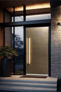 في بعض التصاميم يتم إضافة ألواح زجاجية جانبية بجوار الباب، وهو ما يعرف بالـ Side Panels، هذا التصميم يمنح المدخل إضاءة طبيعية أكبر ويعطي مظهرًا عصريًا أنيقًا.